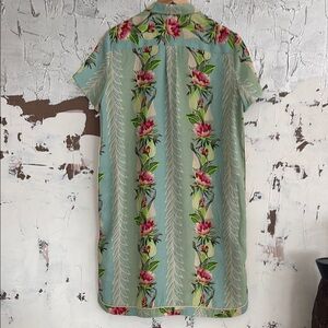 Vibrant floral pool side dress/coverup featuring pink flowers and green leaves. Ideal for casual wear.