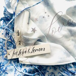 NWT! For Love & Lemons Rosalyn Maxi Dress in Blue. Dreamy asymmetrical patchwork garden and carnation print maxi dress featuring a plunging neckline, fresh white floral lace paneling, and feminine pintucked and ruffle detailing throughout. Partially lined, delicate shoulder ties.