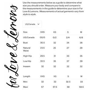 For Love & Lemons is generally true to size. Please refer to the manufacturer's size chart. It is hard for me to measure every garment due to influx of inventory, and every piece is packed away. Also, anytime I made an exception people just ghost me - so please refer to the manufacturer's size chart and know your size.