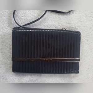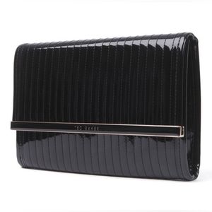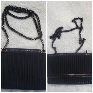 Elegant black clutch with sleek design. Features a wristlet strap. Perfect for evening outings.