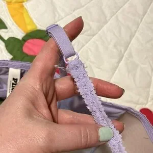 Discover ultimate comfort with this Victoria's Secret wireless, seamless push up bra in a lavender hue. Designed with smooth, molded cups and a seamless finish, it offers a sleek silhouette under any outfit. It has adjustable straps and pull over style. A few loose threads, see photo.