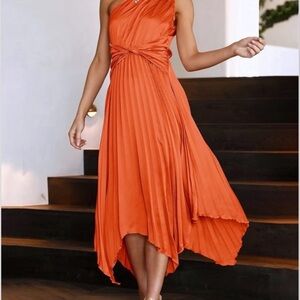 Turn heads with this stunning orange one-shoulder silk dress. Perfect for any occasion, its elegant design and vibrant color make it a must-have. Step out in style and confidence. Great as wedding guest, or any formal and outdoor summer party occasion.