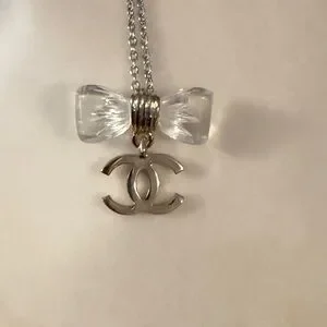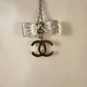 This is a beautiful Chanel bow with silver CC dangle. Can be put on a necklace or bracelet to dress up any outfit.