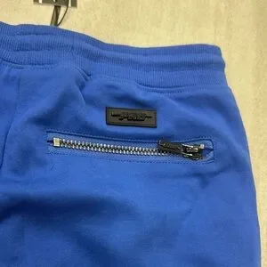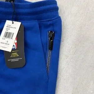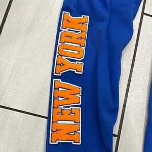 Stylish blue joggers featuring New York Knicks logo and text in orange.