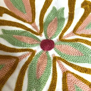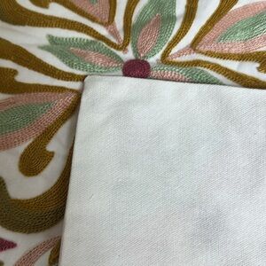 Two Beautiful floral embroidered cloth with intricate patterns. Features green, pink, and brown colors on a white background. Perfect for adding a touch of elegance to any space. Stunning embroidered decorative throw pillow cases in a pair.