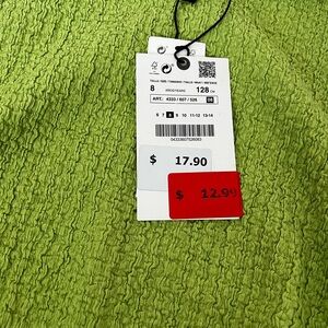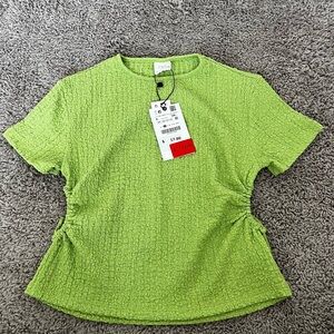 This vibrant green t-shirt from Zara features a stylish ruched and ribbed design, perfect for adding a touch of texture to your wardrobe. The short sleeves and relaxed fit make it a comfortable choice for casual outings. Its round neckline complements the overall chic and modern look.