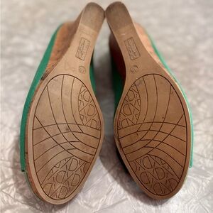 Cute and comfortable Dexflex green wedge heels. They are a smidge more blue-green than the photos show, but bright and cheerful nonetheless. The heel reads close to 3”, but they feel more like a 2-2.5”. Enjoyed them, but time for them to have a new home.