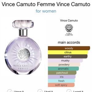Floral fragrance for women. Vince Camuto Femme was launched in 2013. Top notes are Citruses and Pink Pepper; middle notes are Iris, Jasmine and Rose; base notes are Vetiver, Musk, Patchouli, Amber and Vanilla.