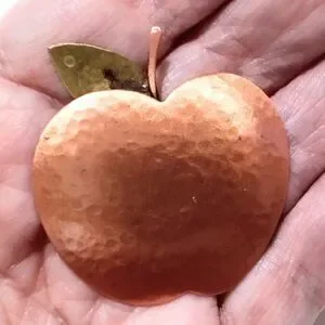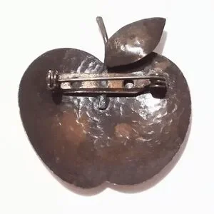 Add a touch of vintage charm to your collection with this delightful apple brooch, crafted in warm hammered copper and topped with a textured brass leaf. The mixed metal design gives it a rustic yet refined appeal, perfect for fall fashion or year-round whimsy. Measuring approximately 1 1/2" wide by 1 5/8" high, this piece is just the right size to make a statement without overwhelming. In beautiful vintage condition, it’s a sweet accessory for any jacket, scarf, or hat — or a thoughtful gift for a teacher, collector, or vintage jewelry lover.