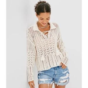 American Eagle Crochet Open Knit Polo Shirt Size M Cream Tassel Cottage Beachy
