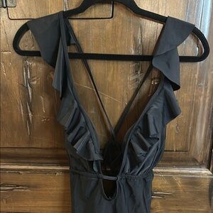 This chic one-piece swimsuit by Cupshe features a deep V-neckline adorned with romantic ruffles that extend over the shoulders. The classic design offers moderate hip coverage, making it a stylish choice for any beach day.