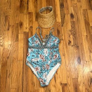 Dive into style with this stunning one-piece swimsuit, featuring a delicate floral print in shades of blue and white. The plunging V-neckline is accentuated with decorative trim, while the strappy back design adds a touch of elegance. Crafted from a smooth, slightly shiny fabric, this swimsuit offers a form-fitting silhouette perfect for any swim occasion.