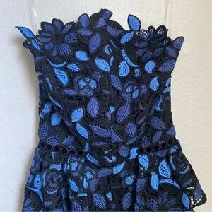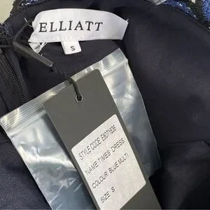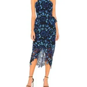 This stunning blue sundress by Elliatt features a chic asymmetrical high-low hemline and a sophisticated halter neckline. Perfect for cocktail occasions, its sleeveless design and elegant floral pattern on a black background make it a standout piece. The dress's fitted bodice and waist-defining details add a touch of modern elegance.