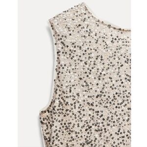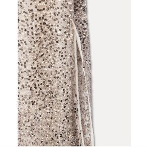 Sleeveless midi dress with a round neck & a slight V in the back. Featuring sequin appliques & lining. Side slit. Side in-seam zipper.