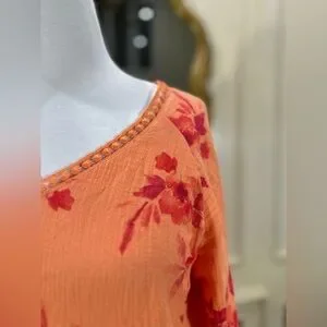 Soft Surroundings Floral Tunic M Coral Peach Boho Crinkle Cotton Gauze 3/4 slv