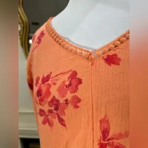 Breezy, feminine, and easy to style — this Soft Surroundings tunic is made from lightweight crinkled cotton gauze in a tropical coral-peach hue with red floral print. Features include pintuck detailing, 3/4 sleeves, crochet trim at neckline, hem, and cuffs, and a relaxed, beachy silhouette that flatters without clinging.