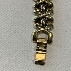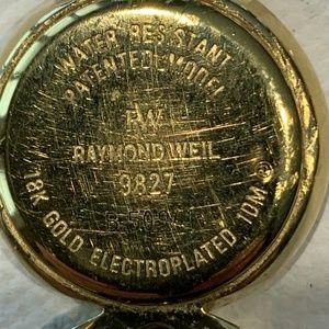 Elegant Raymond Weil watch with a gold-tone case and white dial. Features Roman numerals and a sleek design.