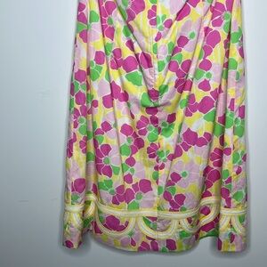Vibrant floral midi dress by Lilly Pulitzer. Features pink and green pattern with yellow accents. Halter neck design.
