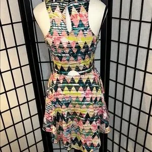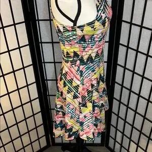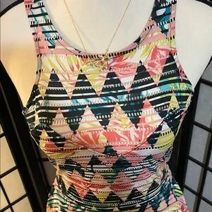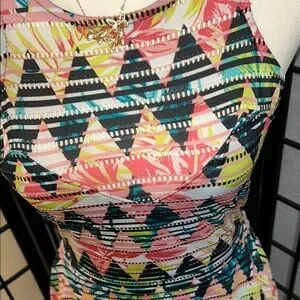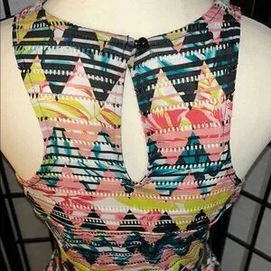 Vibrant high low dress with geometric pattern. Sleeveless design. Perfect for casual outings. 16 1/2 PTP 34 length 13 inch waist! Measurements are approximate! Excellent condition! Please see all photos as they are part of the description!