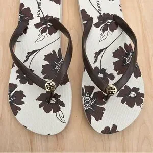 Tory Burch Potting Soil Ivory Daisy Flip Flop Thong Sandal Logo Size 8 EUC