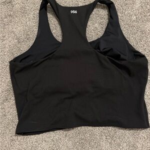 This DSG tank top features a sleek black design with a gray trim, offering a stylish and fitted look. The sleeveless, cropped style is perfect for workouts or casual outings, made from a stretchy fabric that ensures comfort and flexibility. The racerback design adds a sporty touch, making it a versatile addition to your wardrobe.