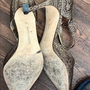 These elegant Manolo Blahnik heels feature a sophisticated brown finish, perfect for formal occasions. The slingback strap adds a touch of modern style, while the medium-height heel ensures comfort and poise. Crafted with attention to detail, these shoes are a timeless addition to any wardrobe. Signs of wear depicted in photo.