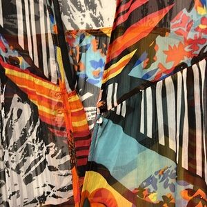 Lightweight, Vibrant, sheer kimono cardigan with a mix of floral and geometric patterns.