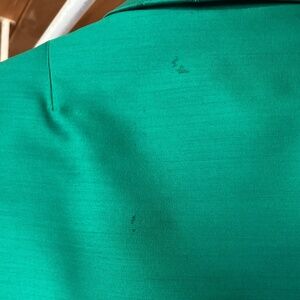 This dress belonged to my mother, who was a fashion-conscious woman. I'm guessing this was custom made due to the way the inseams are finished. The paper tag inside the jacket is difficult to read and I had to tape it back together but I can make out %worsted wool. The percentage could be 25%. There are some flaws in the fabric and the belt can use a bit of a rehab - please refer to the photos. The jacket and dress are both fully lined. There is hand-stitching on the inside of the bound buttonholes as well as the hem of the dress. All in all, this is quite a testament to the fashion of the times - think Jackie Kennedy in her pillbox hat.