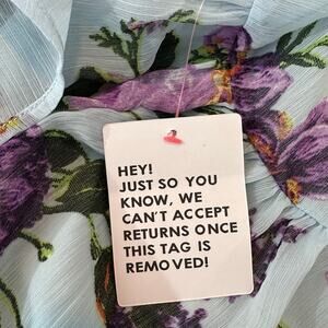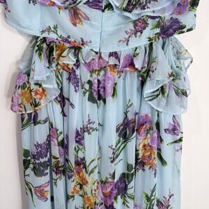 Pretty floral off the shoulder dress from ASOS. Lavender, orange, and yellow flowers on a blue flowy material. Ruffles on the hem and shoulders as well as across the bust. Babydoll bustline and high low hem. Cut outs on the side under the bustline to add some interest.