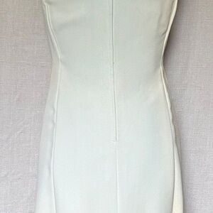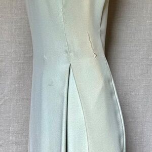 Another of my mother's handmade fancy dresses. There's not a lot of information on the tag (see photo). My guess is it's another size 10: the waist measurement at the belt loops is 30" and the length measured from the shoulder seems to hem is approximately 24". The belt itself is missing. My guess is the dress fabric is a have polyester crepe. The material of the jacket is different and of a heavier woven fabric. There has been fading and some staining of the fabric - see photos. The original color appears to have been a very light blue, almost cream-colored.The Peter Pan collar is rolled at the front and fastened with a fabric-covered button and fabric loop closure. The domed buttons on the jacket are covered in flashy rhinestones. Metal snaps are placed to ensure the front of the jacket remains closed without gaping.