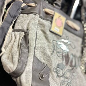 Chic Juicy Couture tote in gray and cream. Features elegant embroidery and chain detail.