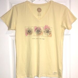 Embrace positivity with this Life is Good Women's V-neck Graphic Tee. Featuring a pretty floral design, this soft yellow top adds a cheerful touch wherever you go. Perfect gift for yourself or any garden lover “Grow your own way”. Excellent pre-owned condition with no flaws or holes!