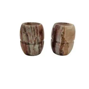 These artisanal onyx candle holders showcase natural stone variations in earth tones, featuring distinctive marbled patterns. Each piece is uniquely crafted with smooth, polished surfaces and rounded forms. The set provides elegant ambient lighting options for home decor.