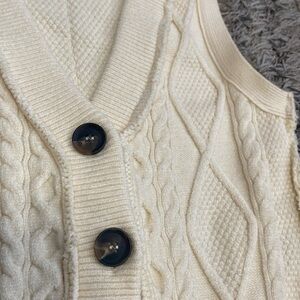 Stylish cream cable knit vest with button-up front. Perfect for layering.