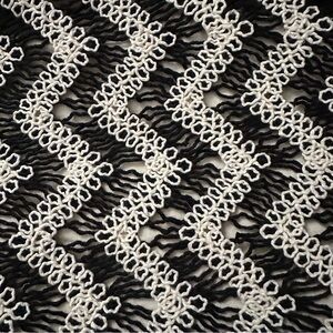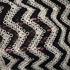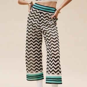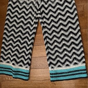 White black and blue/teal crochet pattern pants. Slight crops. High waisted. Zipper at the back. Wide leg. Shorts lining. No stretch.