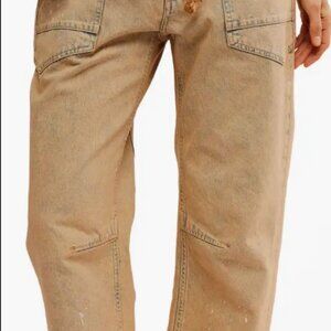 Authentic We The Free Moxie Low Slung Pull-On Barrel Jeans. Crafted with a vintage-washed, paint-splattered finish for a laid-back, worn-in edge. Features a thick rope drawstring waist with oversized grommets and a relaxed, cropped barrel leg. These jeans are effortlessly cool, perfect with a fitted tank and boots or sandals.