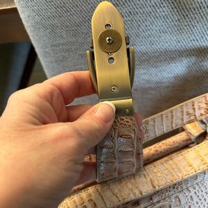 This listing is for a gorgeous handbag by Charlie Lapson. This croc leather bag has a zipper, a buckle snap closure, one interior zippered pocket, and two additional pockets. It measures 21 inches from the top of the straps to the bottom. It has snaps on the bottom and is in gorgeous, excellent condition!