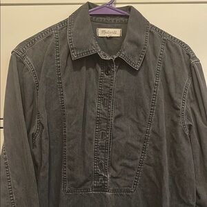This tunic-length Madewell shirt showcases a purposely-faded black hue with a tuxedo-front partial button-down design. EUC. Crafted with attention to detail, it offers a comfortable fit and a classic collar, making it a versatile wardrobe staple. Worn and washed only a handful of times. Signs of wear are from original brand-new intentional design. Great with leggings or tucked in for a classy, casual look.