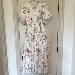 This elegant sundress features a beautiful blend of purple and pink hues, perfect for a wedding guest. The dress boasts short puff sleeves and a plunging neckline, adding a touch of sophistication. Its flowing midi length and airy fabric make it ideal for both casual and resort wear.