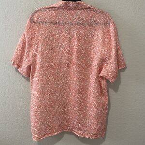 - This abstract floral pink shirt features a spread collar and left chest pocket for a stylish yet functional design.