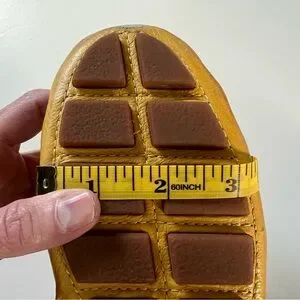 Gently worn moccasin-style driver in yellow leather. See pictures for spots at the toes and heels where the leather is slightly worn. In original box.