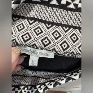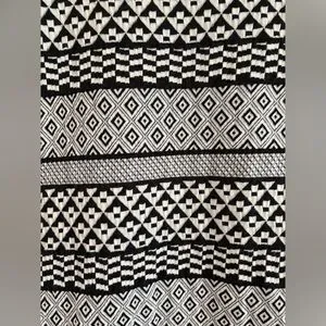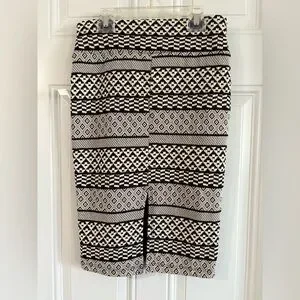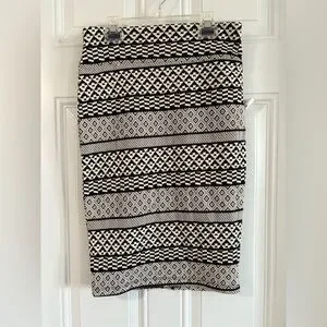 This Charlotte Russe pencil skirt features a striking black and white geometric pattern, perfect for casual or work settings. The knee-length design offers a classic silhouette with a modern twist, thanks to its alternating thick and thin bands of tribal-inspired motifs. Crafted from a stretchy knit material, it ensures a comfortable and flattering fit.
