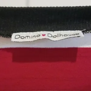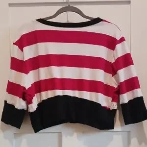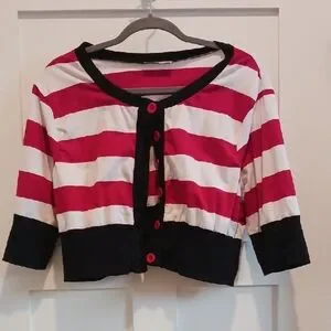 Chic cardigan with bold red and white stripes. Features a classic button-up design. Extremely hard to find now that Domino Dollhouse has closed. Great condition. Very stretchy and comfortable material. Arm length is just below the elbow.