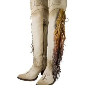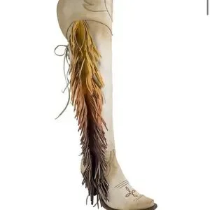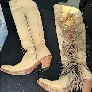 These tan heeled boots from Unk boast a classic Western silhouette with a knee-high shaft and pointed toes. The decorative fringe along the outer side adds a playful touch, while the angled heels provide a modern twist. Perfect for making a statement, these boots are crafted for both comfort and style. 💕The pull up on the zipper is missing 💕