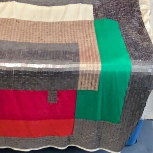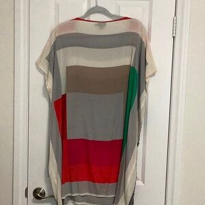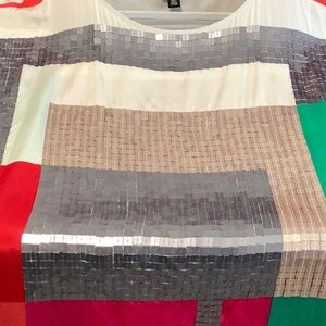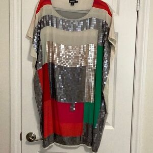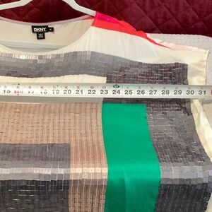 Stylish Silk DKNY Dress with vibrant sequins. Features red, green, and silver blocks. Perfect for a bold look.In excellent preowned condition , worn only one time for Christmas.Pictures are from the actual item and are considered part of the condition statement.