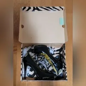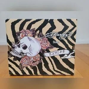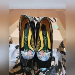 Elevate your style with these Ed Hardy black high heel shoes, featuring a sleek peep toe design and a striking platform sole. Crafted from shiny black patent material, these heels are perfect for formal occasions, offering both elegance and a bold statement. The contrasting yellow insole adds a unique touch to these standout shoes.