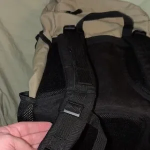This backpack features a stylish tan and black color scheme, offering a practical and functional design for everyday use or light hiking. Its durable construction ensures reliability for those on the go.