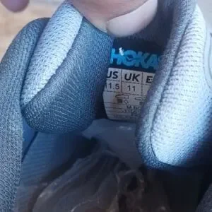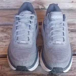 Experience unparalleled comfort with Hoka's athletic shoes, featuring a breathable gray knit mesh upper and a signature thick white midsole for maximum cushioning. The Meta-Rocker geometry ensures a smooth ride, making these shoes ideal for running and other athletic activities.