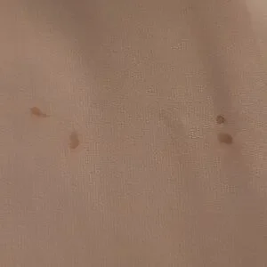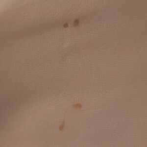 There are a couple small stains on the front, as seen in photos. You might be able to get it out, I just haven't tried. Otherwise, only worn once and in great condition.