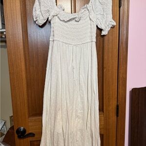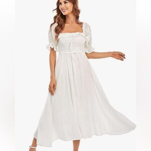 This elegant white smocked dress features a classic design with puff sleeves, perfect for any occasion. Enjoy the comfort and style of this timeless piece.